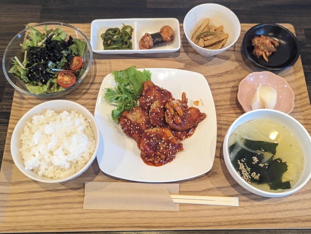 メインディッシュのヤンニョムチキンに加えて、副菜も複数ついてきて彩りもあります。